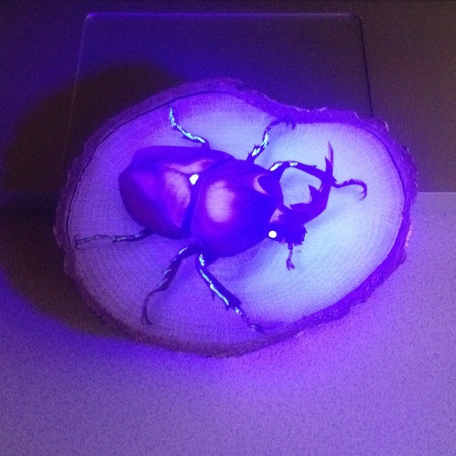 大好評の赤い国産カブトムシ。 「赤いカブトムシ ホワイトアイ Version2」が好評につき、オーダーが入ったので制作しました。 シーズン過ぎのためかクヌギの木(くぬぎ小輪切)が入手困難で、あまり良い形のがなく、前回のカブトムシの大きさだとうまく収まらなかったため苦肉の策で、左右反転して描いてみました。 目と手足は夜光塗料を塗っているので、ブラックライトを当てると光ります。