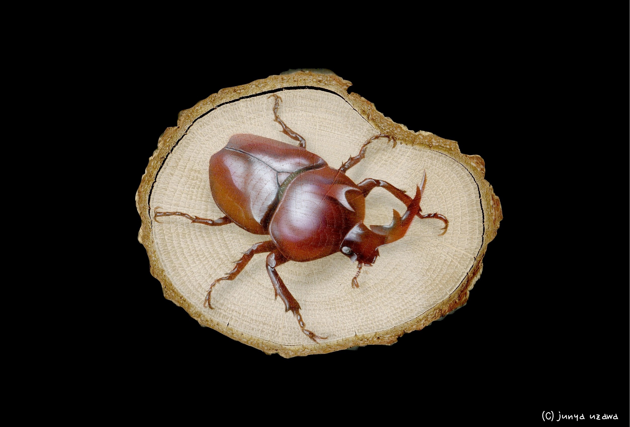 大好評の赤い国産カブトムシ。 「赤いカブトムシ ホワイトアイ Version2」が好評につき、オーダーが入ったので制作しました。 シーズン過ぎのためかクヌギの木(くぬぎ小輪切)が入手困難で、あまり良い形のがなく、前回のカブトムシの大きさだとうまく収まらなかったため苦肉の策で、左右反転して描いてみました。 目と手足は夜光塗料を塗っているので、ブラックライトを当てると光ります。