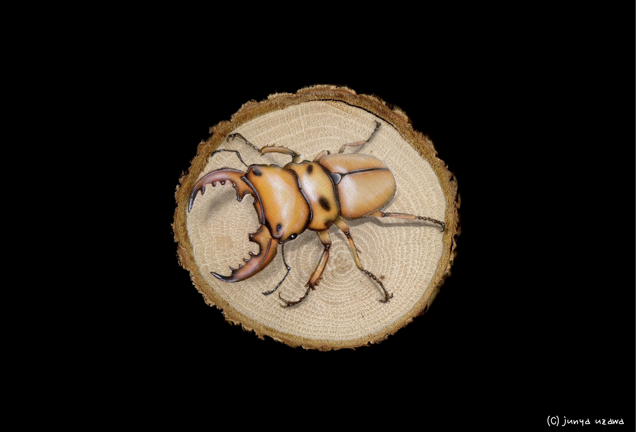 木工細工のような美しい色のクワガタムシ。 クワガタムシのことを色々調べていたら、たまたま発見した美しい模様のクワガタです。 最初は画像検索で出て来たのでこのクワガタの名前がわからず、判明するのに苦労しました。。。 変わった模様の割には、意外と簡単に描けました。 短時間で出来た割には良いものが出来たと思っています。 これも他のビートルシリーズと同じくクヌギの木(くぬぎ小輪切)に描いています。