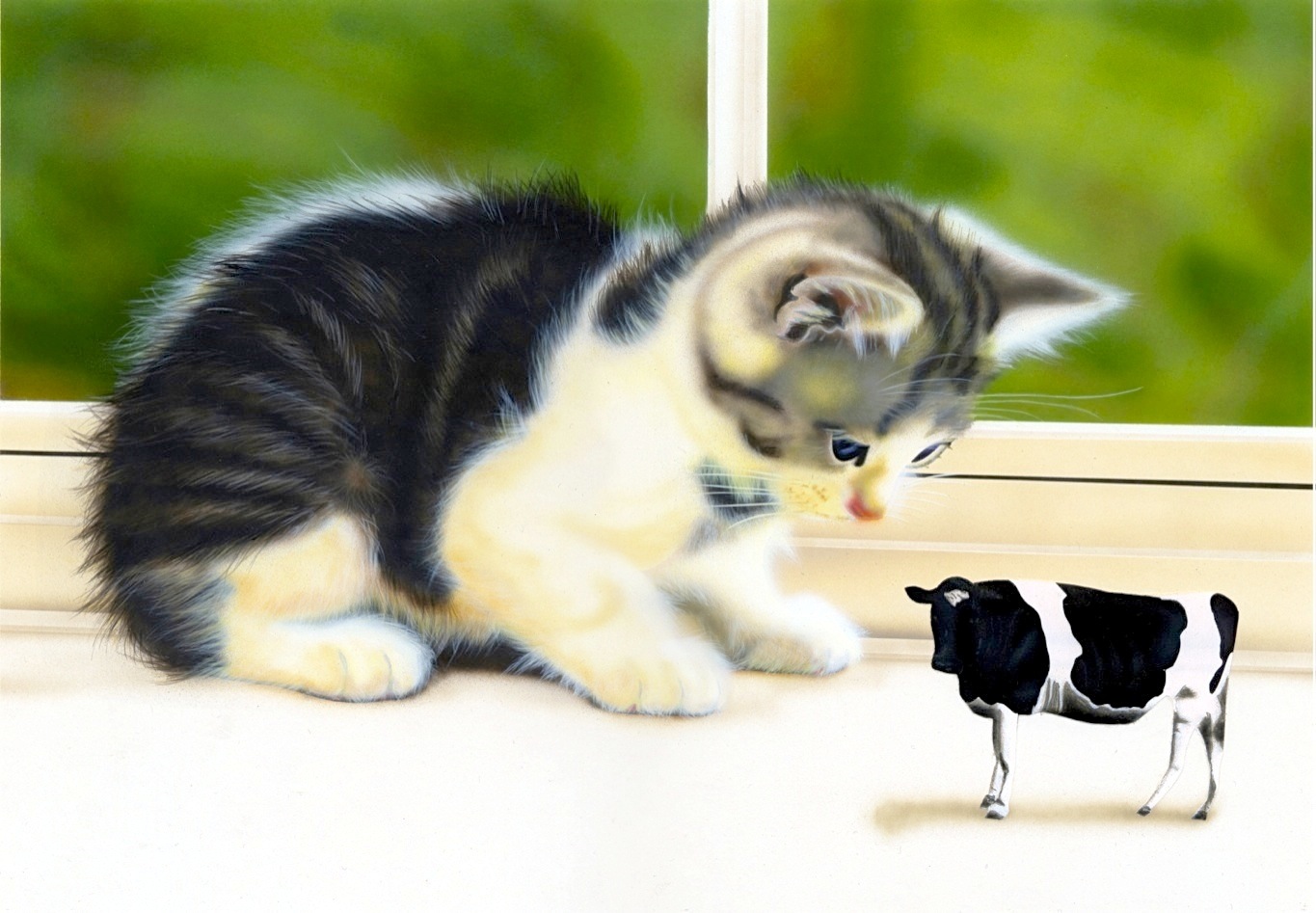 なぜ『牛』かと言うと、丑年の時の年賀状用イラストだったからなんです。完成したのがクリスマスなのでギリギリですね。『牛』は別パーツになっていて、透明のプラ板に描いてあります。(当時、パソコンを持って得いなかったため)いつか『牛』を他のどうぶつに描き換えて他の年の年賀状に使おうとしたんですが、その機会はしばらくありそうにないです。