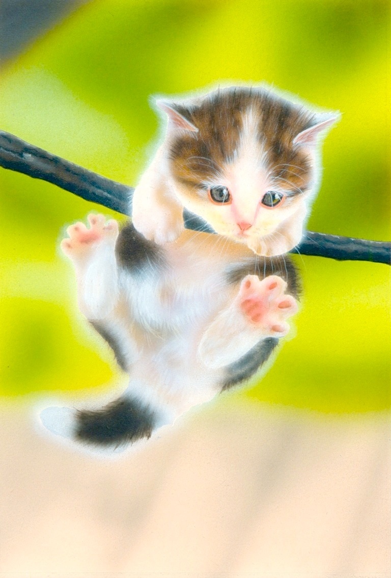 たいていデザインが決まるまでは、ウチにある猫や犬のカレンダーやポストカードをながめているんですが、この「ねこが木にしがみついている」絵柄は3種類くらいありました。(木がくさりになってるものもあるんですが)それらをそっくり模写するのは簡単ですが、それではパクリになってしまうので、それら3種類をミックスし、さらにねこの柄をアレンジして描きました。これで、どっかで見たことがあるようだけど、実は見たこと無いオリジナルなイラストが完成しました。 |
