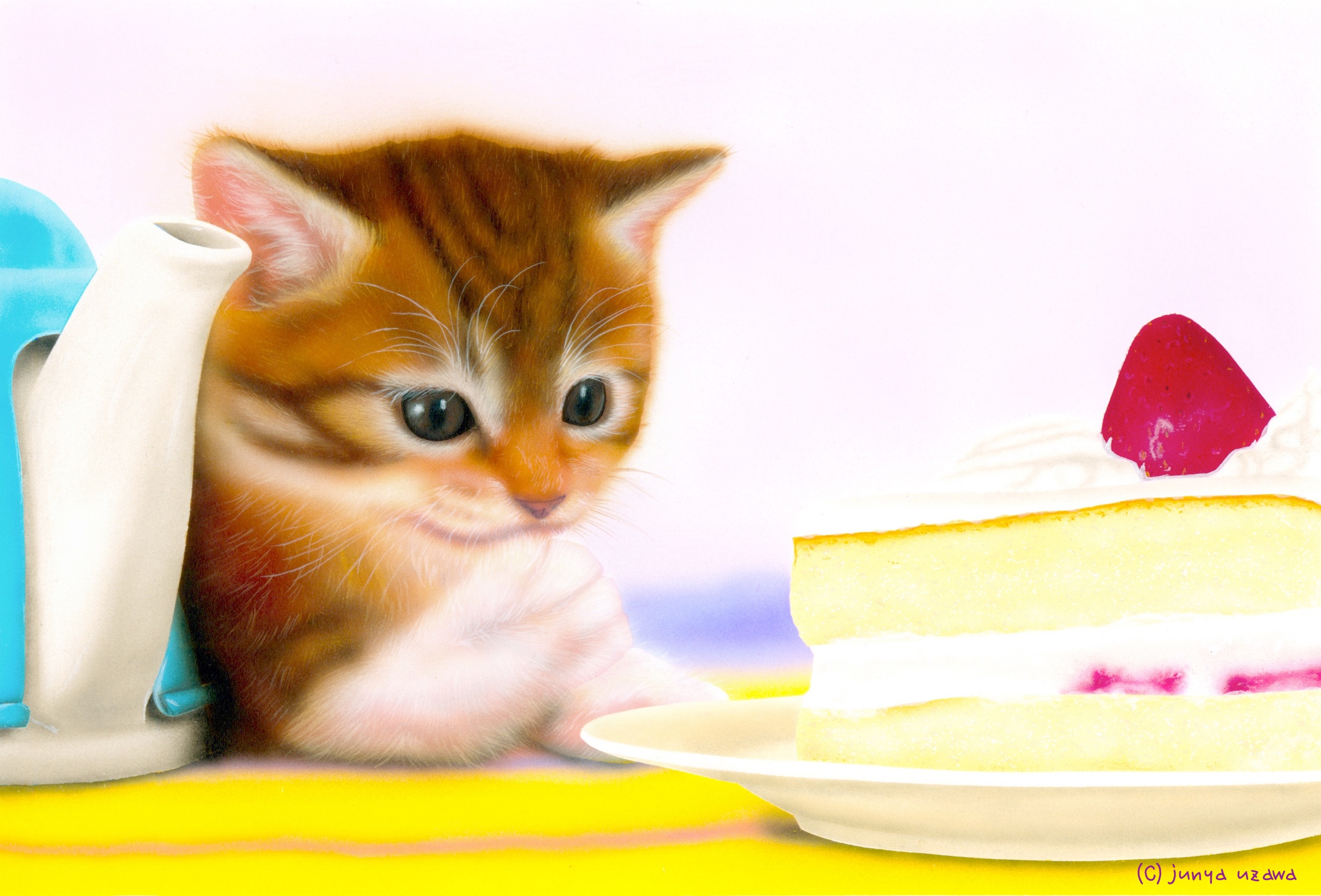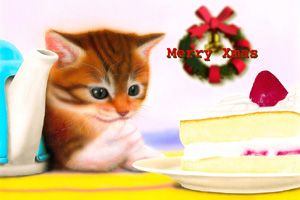 | もうお解りかと思いますが、「Happy Birthday!」の前の物語の作品になります。なので、登場しているのは、同じねこちゃんなのです。描いたのはこっちが後ですが、デザインを思い付いたのはこっちが先です。ヤマトシステムさんの『e-greetingcard』用(テーマ:クリスマス)に描いた作品なんですが、あまりクリスマスっぽくないです。(e-greetingcard版には、この絵にCGでクリスマスリースを追加してあります) |