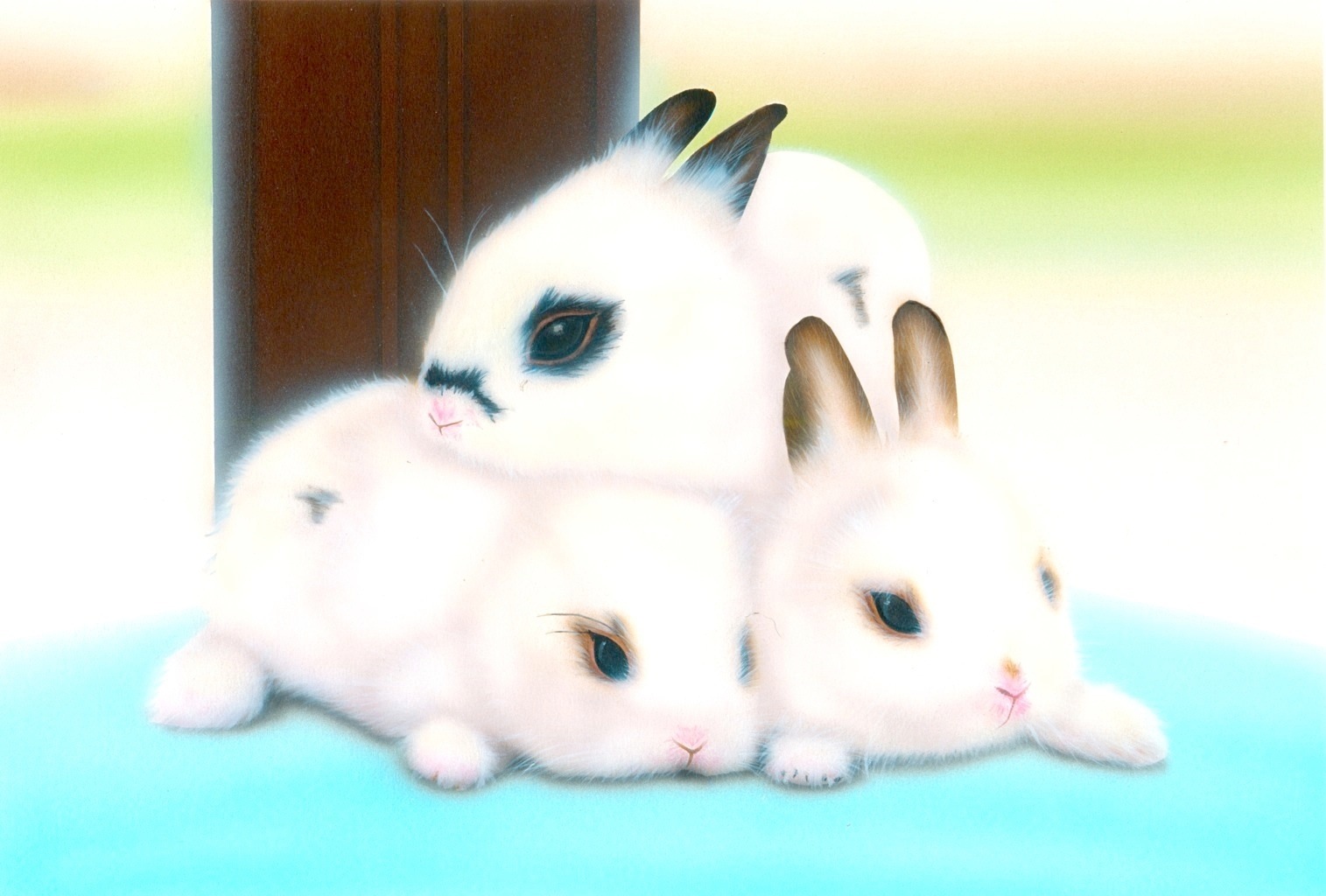 前作『結婚祝い』の続きなので、今作も「うさぎ作品」です。前作『結婚祝い』のプーちゃん&ミーちゃんの子供を想定して描きました。『結婚祝い』を描こうとしていた当時はミーちゃんが妊娠していたので、これを描く頃には実際のミーちゃんの子供を描けると思っていたのですが、間に合いませんでした。この絵が完成した5日後、(8月10日)ミーちゃんは無事、子供を出産しました。残念ながら1匹しか産まれませんでしたが、ミーちゃんにそっくりで元気なコです。しかも、その約2ヶ月後、またミーちゃんが出産しました。今度は5匹(!!)です。もう『うさぎパーク』寸前って感じです。みんなこの絵のコにそっくりなんです。 |