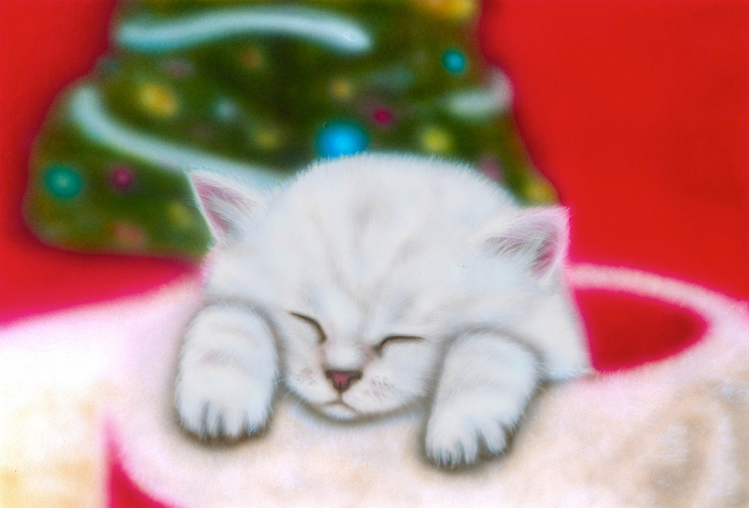 | 『e-greetingcard』、『テーマ:クリスマス』用に描いたものです。昨年も『クリスマスカード』は二枚も作成したんですが、どちらもあまり「クリスマスチック」ではなかったので、今年はかなり「クリスマスチック」にしてみました。バックが鮮やかな真っ赤なのでかなり目が疲れました。これもカラーテーマ(赤)があって意識して描いたものです。これでカラーテーマ三部作(赤、青、黄色)が出そろいました。実は、この『チンチラ・シルバー Ver.』はあまり気に入ってなかったので、のちに(次ページの)『チンチラ・ゴールデン Ver.』に描き換えられました。そのため、この『チンチラ・シルバー Ver.』は今は現存しない幻の作品になってしまいました。 |