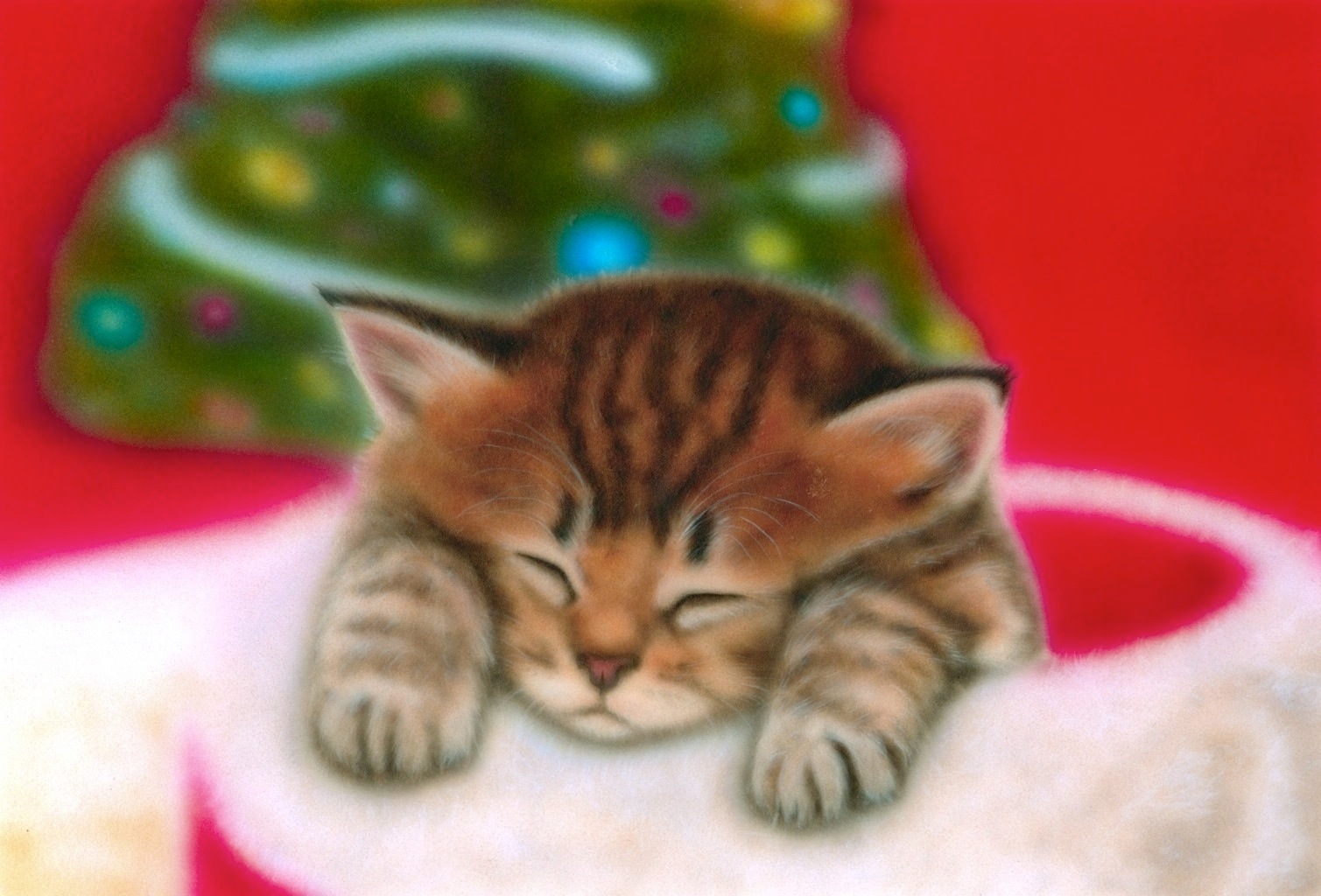 | 前に描いた「Merry Christmas -2002- (Chinchilla Silver)」の完全版です。もともとラフスケッチの段階では、この『チンチラ・ゴールデン版』だったんですが、あまり白いネコを描いたことが無かったので、あえて白っぽい『チンチラ・シルバー』に挑戦したんですが、失敗(?)してしまいました。ネコ自体はあまり悪くなかったのですが、背景がアニメちっくだったのでなんかあまりリアルじゃなくなってしまったんです。で、泣く泣く 『チンチラ・シルバー』の上から『チンチラ・ゴールデン』の柄を描き加えていったのです。ちょっと時間かかっちゃったんですが、(+3時間!)その甲斐あっていい作品に仕上がったと思います。 |