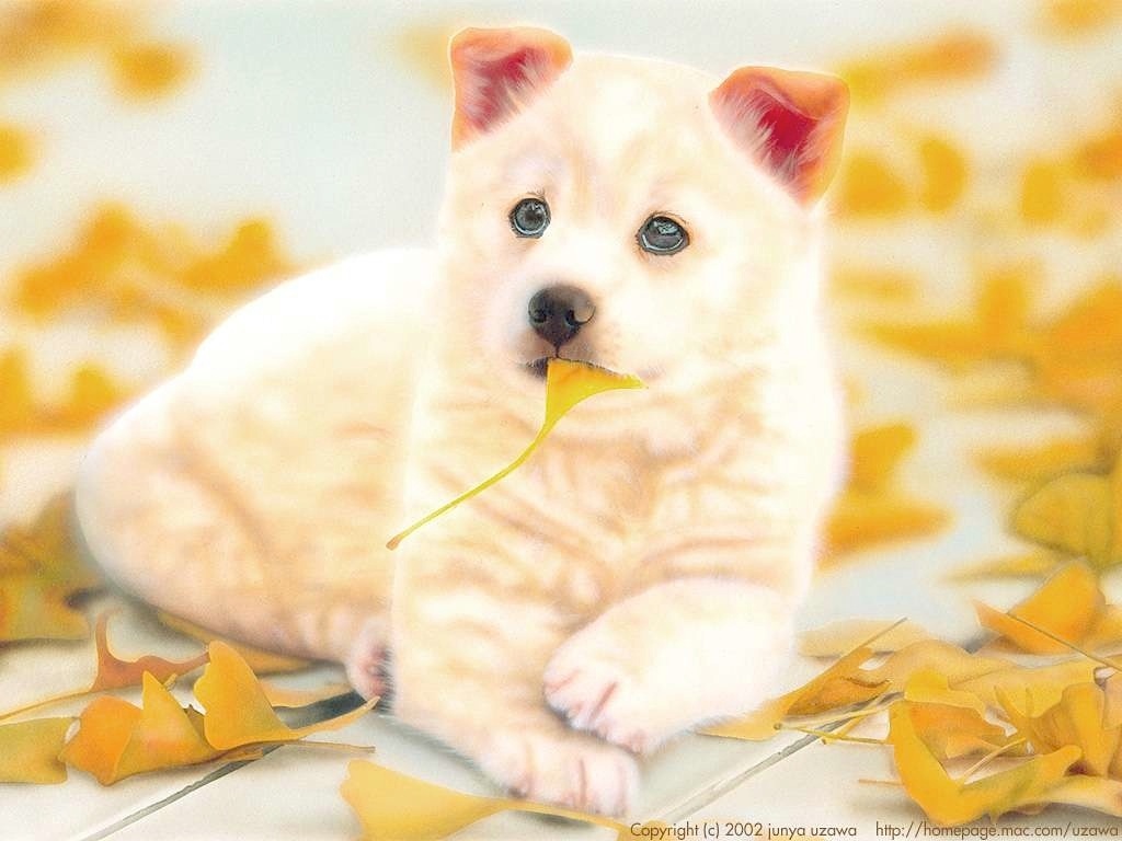 久々の『こいぬの絵』です。これは仕事用に描いたもので、「写真そっくりに!」との依頼だったのでウチにあったカレンダーの写真を見て描きました。現時点での技術を全力で注いで描いたため、自分でもびっくりするほどの出来映えとなりました。おかげでクライアントの方も大絶賛してくれました。意外と背景のイチョウが描くのにすごく苦労しました。