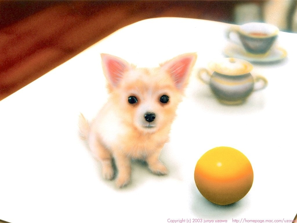 最近の『チワワブーム』にあやかって描いた作品です。CMのわんちゃんみたいに目をうるうるさせてみました。でも、紅茶が置いてあるのに、わざわざボールなんて渡さないですよね、ふつう。