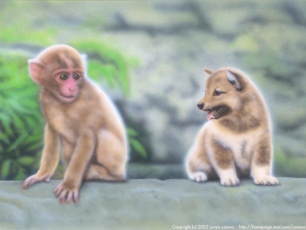 の写真があったのでソレに決まり、描くことにしました。サルだけだと、あまりカワイサがたりないので、人気出ないだろうと思い「子犬」も付け加えてみまし