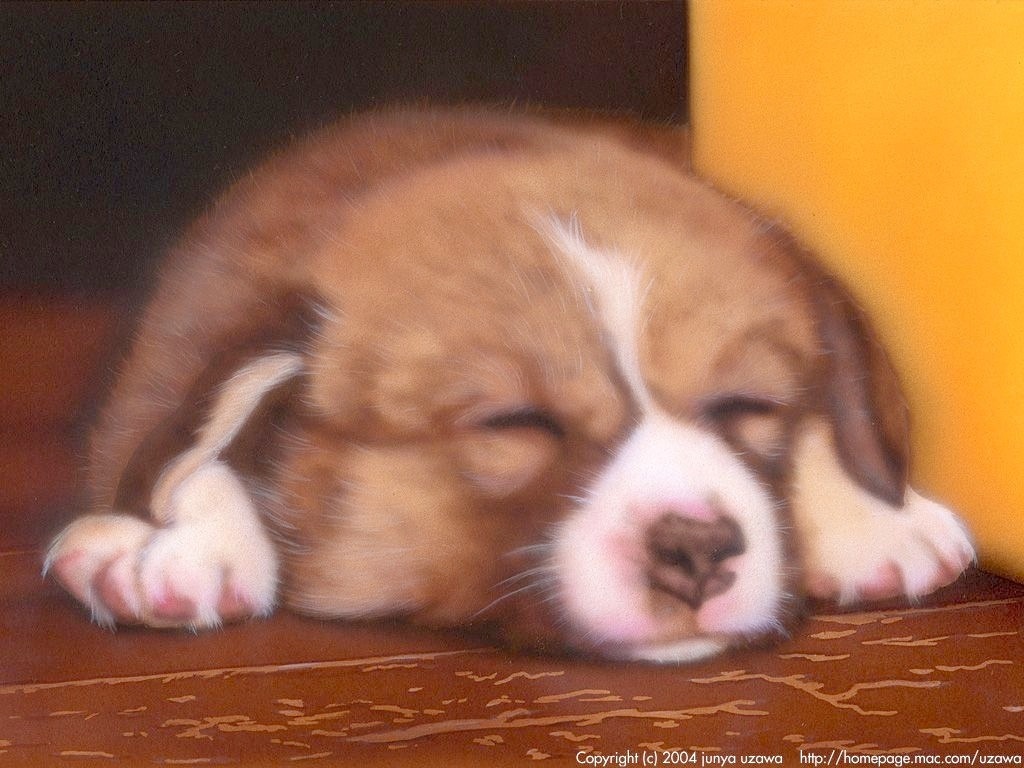 今作は久々に背景にリアリティを追求した作品で、わんこの手前のフローリング部分の「はげ」た質感を再現してみました。(でも、あまり注目されないんでしょうね…)