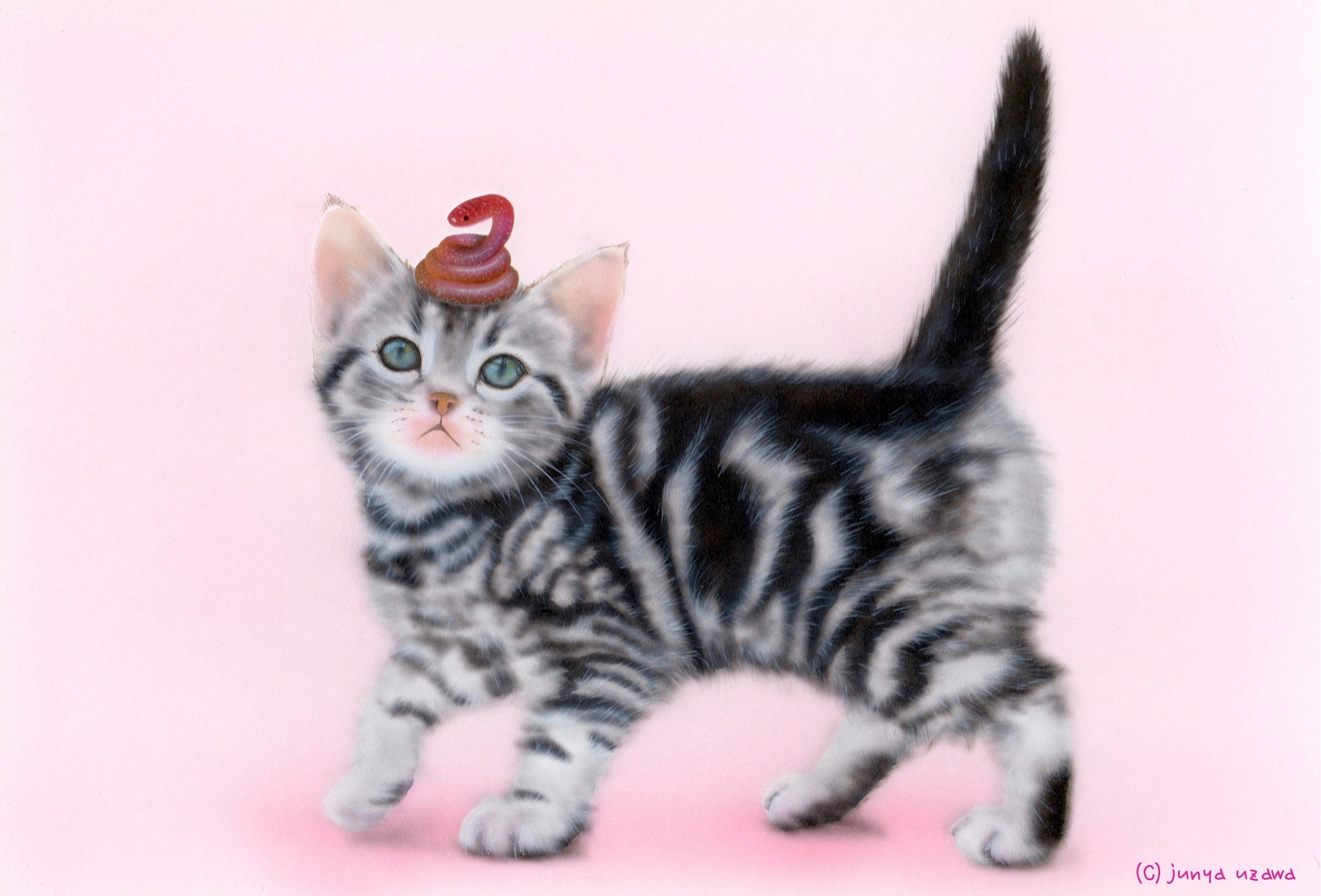 一昨年は、母方の祖母、 昨年は、父方の祖母が亡くなって出せなかったので、寅年以来2年ぶりの年賀状用イラストです!! 12年前にも父方の祖父が亡くなっていたので、ヘビ年のイラストは初ですね。と言っても、面積のほとんどが子猫が占めていますけど…。